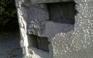 The severity of the damage caused by mica has resulted in large horizontal cracks on exterior walls and long vertical cracks in the corners of buildings, reaching from top to bottom. This has significantly affected the integrity of the building, with some of the brick work crumbling to such an extent that it is possible to dislodge it with bare hands.