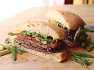 7. To assemble the sandwich, place the meat inside the bread followed by the sliced tomato and the green beans.