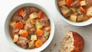 Meat, 8 diced bacon strips, 3 pounds beef stew meat (cut into 1-inch cubes), 4 cups reduced-sodium beef broth;