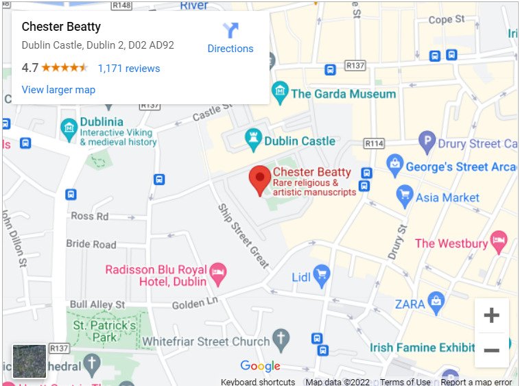 Sir Chester Beaty (1875- 1968) was a renowned American mining engineer, philanthropist and collector. While The Chester Beaty Museum started life as Beaty’s personal, private library today it is one of Europe’s predominant holders of rare books and manuscripts. Working to preserve the teachings and expressions of many different cultures from around the world.