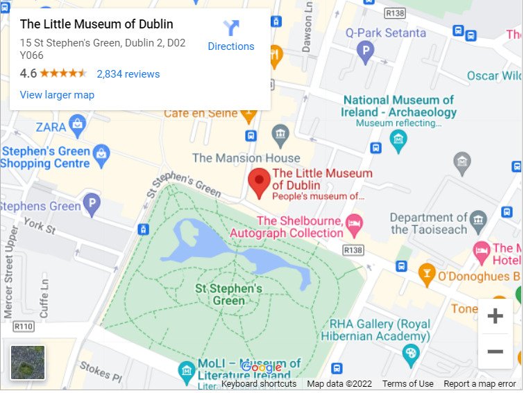 A quaint little museum found on Stephen’s Green, the Little Museum of Dublin is just that. The exhibitions in this museum frequently rotate but they all have a connection to Irish history or culture. The museum is currently partnering with the National Museums of Northern Ireland to host some of their collections. These collections explore the concept of “Irishness” in relation to the country’s shared and often complex history. Another exhibit focuses on the history of women in Ireland.