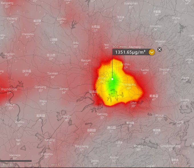 Another indirect piece of evidence is from windy.com, who, on 9 February, reported a massive release of sulfur dioxide gas (SO2) at 1351.65 ug/m3 from the outskirts of Wuhan. Sulfur dioxide gas is usually emitted from the burning of organic waste. While it may be from the result of the burning organic material such as municipal garbage, hospital debirs or animal carcases, a more morbid conclusion would be that of contaminated human waste being disposed of. Based on such a high level of SO2, we can calculate that it would take the burning of 14,000 bodies to reach this emission.