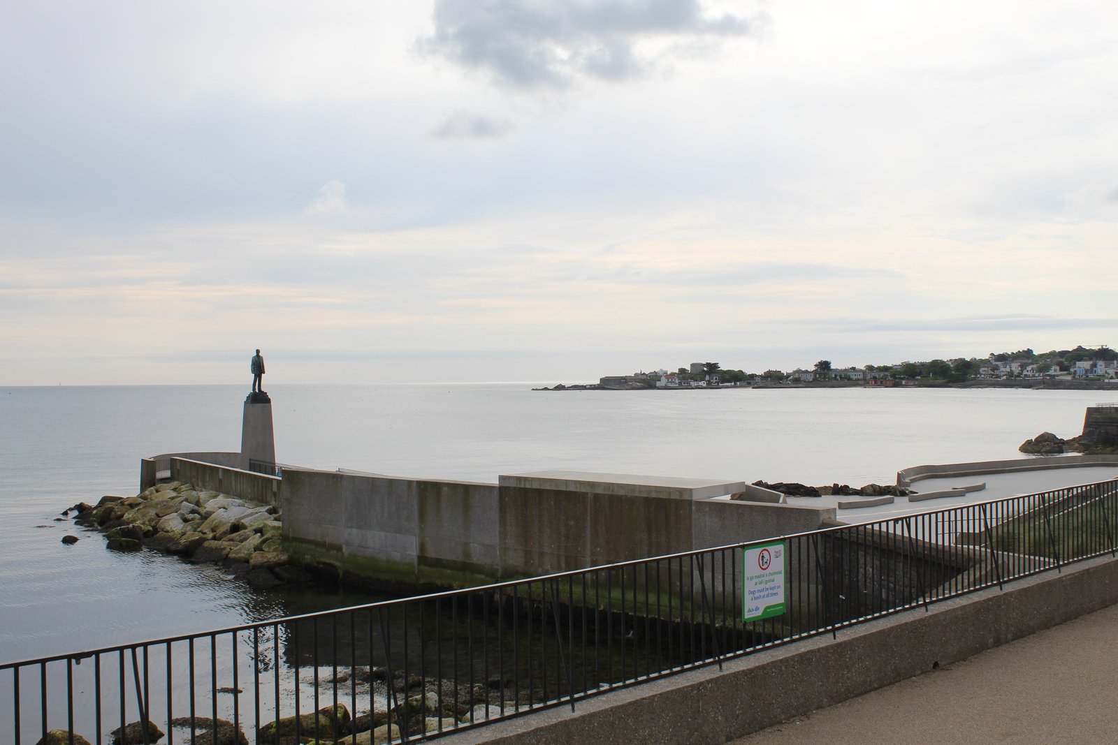 What this specific photograph shows of the Dún Laoghaire Baths is the Roger Casement statue and part of the walls and pathway of the baths on the horizon. This section and the rest of the baths is easily accessible from both its left and right hand side. This photo also shows the houses up ahead in the Dun Laoghaire area and also further ahead in Sandycove.
