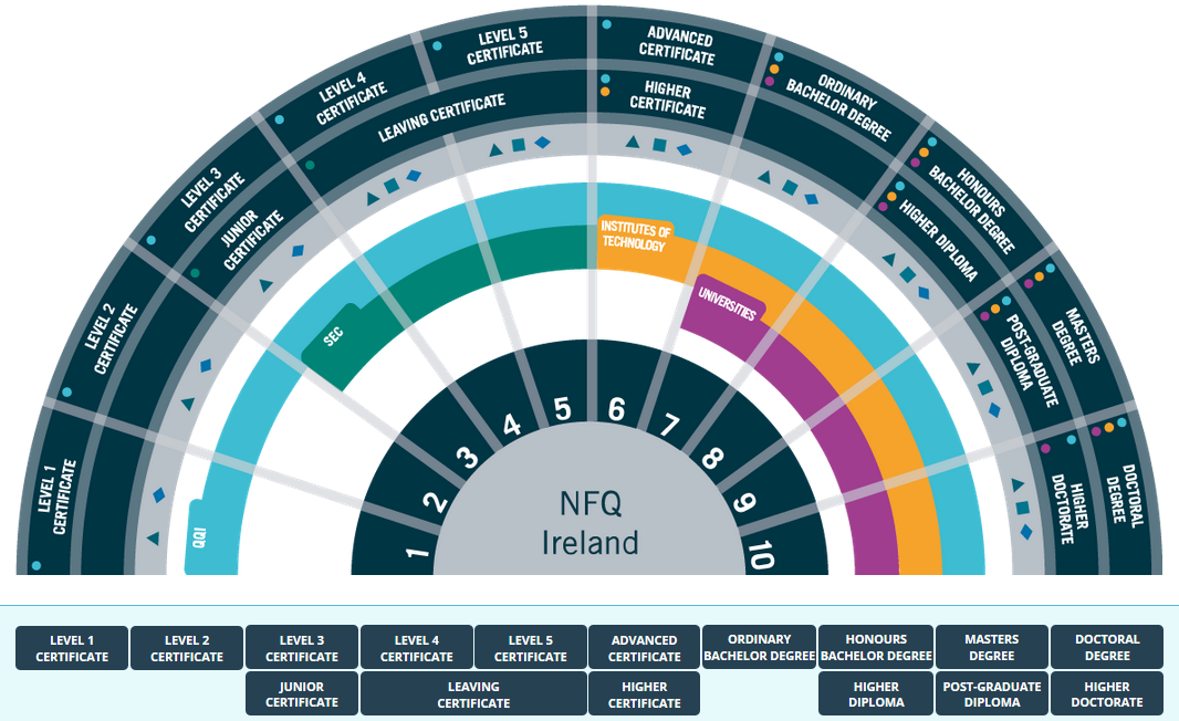 Ireland has its own framework of qualifications (NFQ) made up of 10 levels, which was created in 2003. It sets out what each qualification says about what learners know, understand and can do. It also sets out qualification pathways from one NFQ level to the next. For instance, NFQ levels 4 and 5 are equivalent to Leaving Certificate and NFQ Level 9 to a master’s degree.
