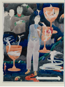 Clarke’s inky watercolour, The Magic Glasses (c.1926), is a perfect example of his interest in the decadent and dissolute – it was a sketch for one of the sections for a window that had been commissioned by the Irish government in 1926 for the International Labour Court in the League of Nations in Geneva. When Clarke finished this piece, the government officials rejected it as they were afraid of possible controversies it would attract from the conservative public. Clarke died from tuberculosis in 1931, whilst negotiations with commissioners were still in progress, and, consequently, the window never made it to Geneva due to the Irish government’s outright refusal to partake in this process.