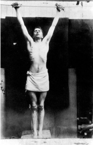 Clarke exuded the aggressive brutality of the 20th century along with his own idiosyncratic fantasies. He seems to have been heavily influenced by the idea of crucifixion and the notion of mortality. For example, he stripped down for photographing his own crucifixion and in these revealing photographs, his body seems to be echoing the trauma of famine, revolution, and war – as well as auguring the wasting disease that would eventually kill him.