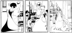 Critically acclaimed Aubrey Beardsley, who wrote “The Ballad of a Barber”, creates a similar scene in both versions of his “Toilette of Salome and in The Coiffing”:
