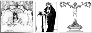 Furthermore, it is also worth evaluating how his “decadent” thought process was significantly dissimilar from his contemporaries. Unlike the Romantics, who praised visually-pleasing aspects of the world like nature and beauty, the decadents took a completely contrasting approach and looked down on the idea of a God and higher spiritual realms, unlike devout Christian believers. Finding themselves submerged in their own melancholy, uneasiness, and a sense of incompleteness, they tried examining the unnatural as their only hope. Poems and illustrations, therefore, were filled with images of jewels and instances of extreme slyness, such as masks, gold-works, and particularly perverse examples of natural phenomenons.