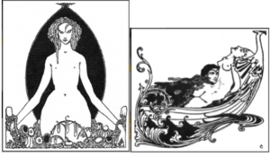 Clarkes’ representation of female figures also screams perversity. The first image shows a wide-hipped woman, who appears naked and can be seen staring straight out at the viewer. The page decoration that Clarke did shows a clothed man and nude woman in a boat with the man’s face leaning against the woman’s breasts as he grabs her thighs. Clarke draws the woman’s arms behind her as she throws her head back.