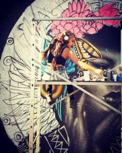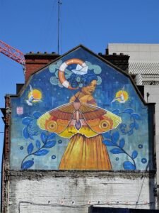 Since her arrival over a decade ago, the Red Cosmic Dragon of Irish street art, all passionate and cosmological, has become one of the country’s most admired public artists. She’s also in great demand: this week, Kathrina is working on a major piece at 27 Sir John Rogerson’s Quay by the Samuel Beckett Bridge, a meditation on duality and transformation in the form of a woman with butterfly wings. It’ll be more than 100m² when it’s completed.