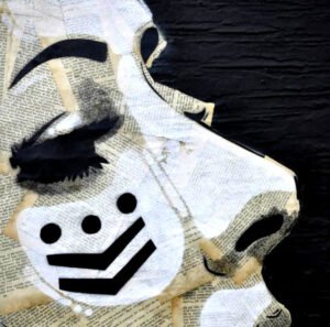 Kathrina claims Mayan culture among her influences and this explains her pseudonym, KinMX. MX alludes to her Mexican origins, while Kʼin is the smallest unit in the ancient Mayan Long Count Calendar system – it also means “sun” in the Mayan language. Indeed, time is an important theme in Kathrina’s work – and art’s ability to capture a moment in time. For instance, certain of her works use newspaper not only as an art material, but also as a thematic clue. An abiding interest in anthropology also informs Kathrina’s work; with Mayan, Toltec, Tibetan, and other motifs and ideas found throughout.