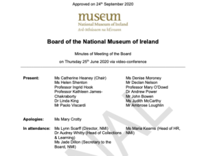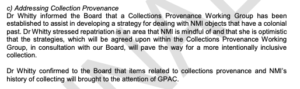 With regards to Irish cultural institutions and their acquisition history, the excerpts from the Board meeting of the National Museum of Ireland shown below, are a key indicator of Irish institutions’ openness to implementing substantial changes.