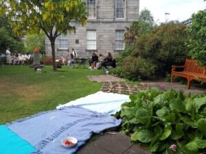 The performance itself, was outside in the Rose Garden in Trinity College. There were blankets laid out on the grass and a couple of benches for people who reserved a seat. There were a couple of bees and even a pretty little bird who joined in to watch at one point. Though I think the bird was more interested in the bush with the berries than the actual performance. How rude of him. We were lucky that it didn’t start raining again the entire evening. Because around noon it had been pouring.