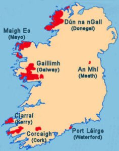 There are some parts of Ireland where Irish is still the predominant language spoken – these are called Gaeltachts. They reside mostly on the west side of the country, in counties such as Donegal, Mayo, Galway, and Kerry. This was because colonising began in the East, and the West was affected by the shift in language much slower. There are other counties that have small Gaeltacht regions too, such as Waterford, Cork, and Meath. In Secondary School, particularly in 2nd Year and 5th Year, it is common for students to go to Gaeltacht areas, generally for a period of three weeks, to immerse themselves in the language in order to achieve a better result in their Junior and Leaving Cert exams in 3rd and 6th year respectively.