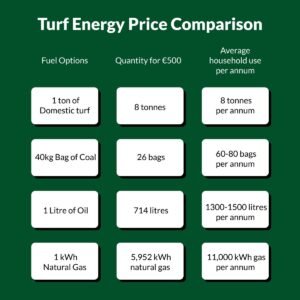 Aside from the nostalgic elements of turf and the cultural heritage attached to it, between environment and necessity, we must turn our attention to the sordid topic of coin. The simple answer as to why the Irish people continue to burn turf is that as a fuel source, it is by far the cheapest option. As an indigenous source of fuel, it makes sense to use it and when you look at the price comparison below, it’s obvious as to why there has been resistance. The graph below shows how much fuel €500 will get you when you spend it on turf, coal, oil, or natural gas.